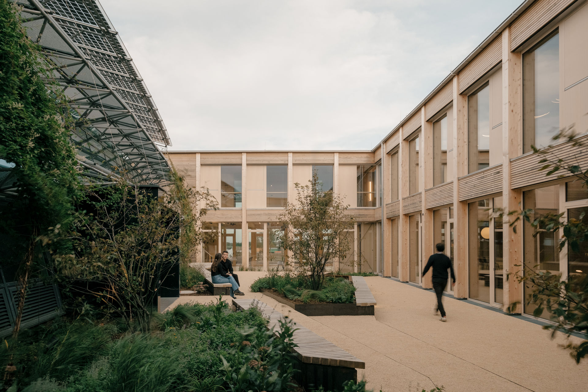 Der Entwurf löst diese Aufgabe, indem das Gebäude in Richtung der Straße um einen zweigeschoßigen Baukörper erweitert wurde, der ein gemeinschaftliches Atrium im Zentrum als Verbindungsstück und Kommunikationsbereich umschließt. Damit wurde eine kompakte Kubatur geschaffen, die möglichst wenig in den Bestand eingreift, sondern ihn vielmehr weiterführt und im neuen Ganzen integriert. Mit dem Neubau entstand ein ganzheitlich nachhaltig gedachter Holzbau, der sowohl ökologische Aspekte des Bauens, zukünftige Nutzungsflexibilität, als auch innovative Gebäudetechnik in sich vereint.