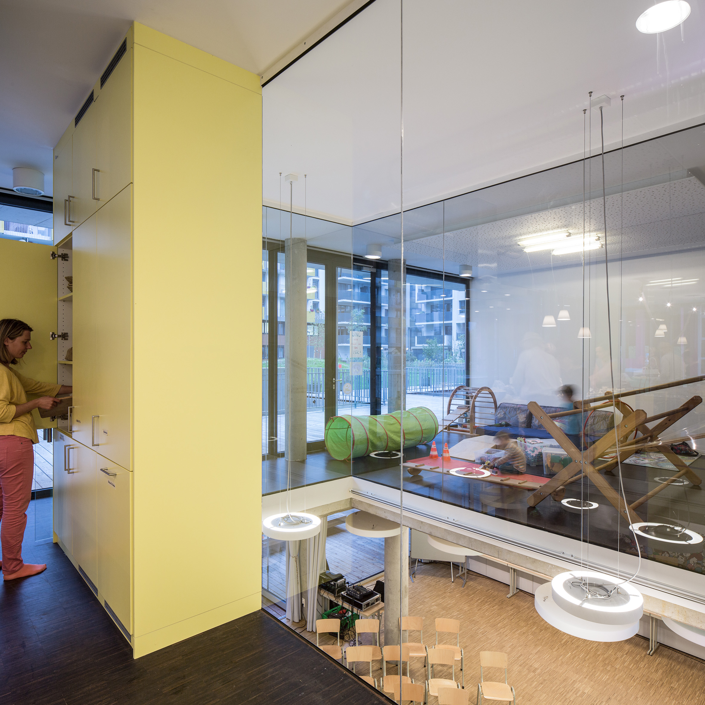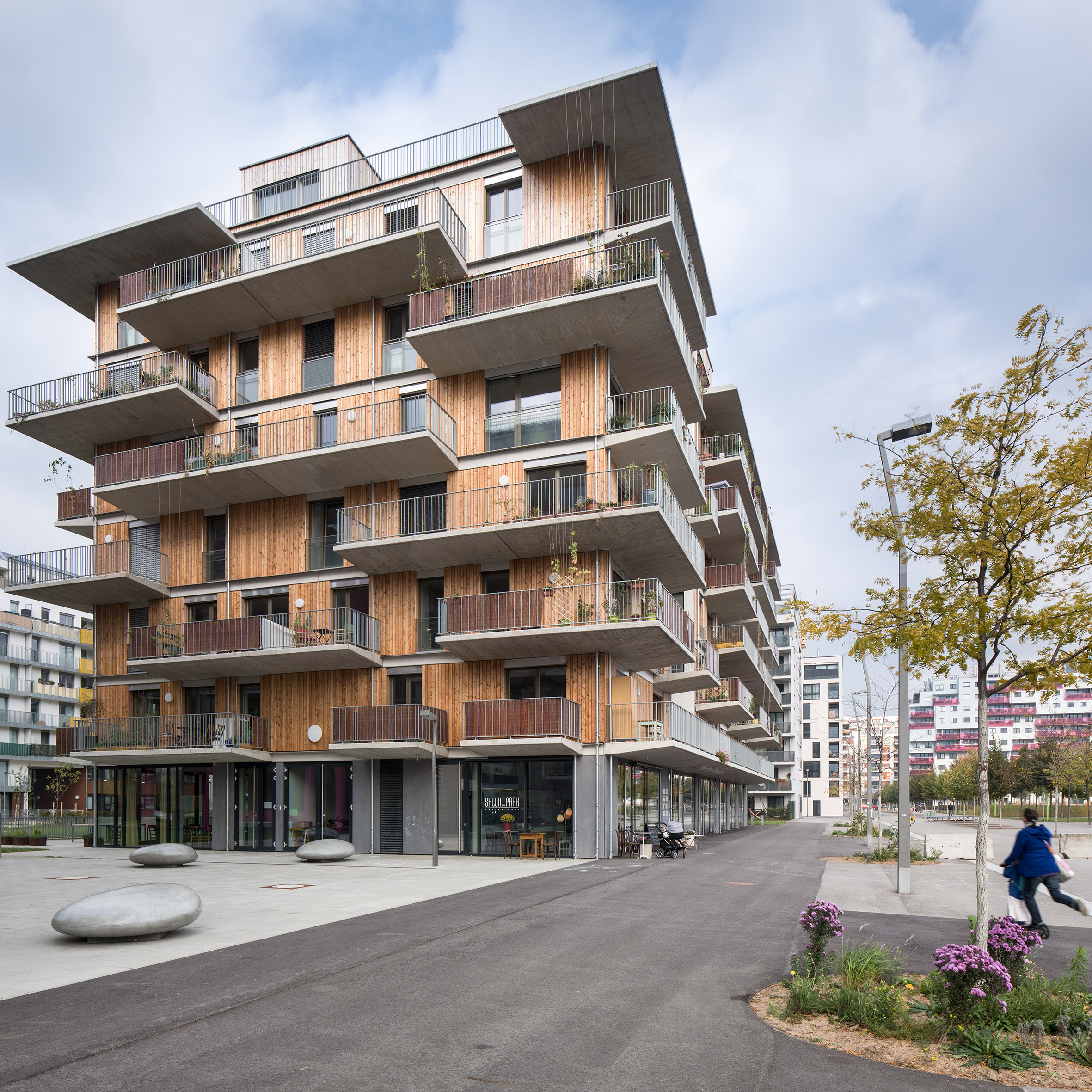 Im Gelände des ehemaligen Nordbahnhofareals findet sich dieses Wohngruppenprojekt mit Holzfassade vor massiver Bauweise. Durch ein findiges Finanzierungskonzept versucht das als Wohnheim errichtete Haus Spekulation auszuschließen und leistbaren Wohnraum zu schaffen. Die Volumetrie wird durch zwei große Einschnitte bestimmt, die das innenliegende Stiegenhaus als hellerleuchtetes Zentrum definieren. Hochwertige Gemeinschaftsräume im Erd- und tagesbelichteten Untergeschoss werden mit Sauna und Terrasse auf dem Dach gekrönt. Unter dem Motto „für die Gäste das Beste“ finden sich dort auch Gästewohnungen, die von allen BewohnerInnen und ihren BesucherInnen bedarfsweise genutzt werden können. Neben dem durchdachten Energiekonzept mit Niedrigstenergiestandard hat dieser Zugang sehr viel mit gelebter Nachhaltigkeit zu tun: Räume, die anderswo selten genutzt werden oder nur gegen höchstes Entgelt bezogen werden, werden hier einfach geteilt und beispielhaft „für alle“ in Wert gesetzt. Das Projekt besticht insgesamt durch seine gezeigte Modularität und offen gelebte Nutzorientierung.