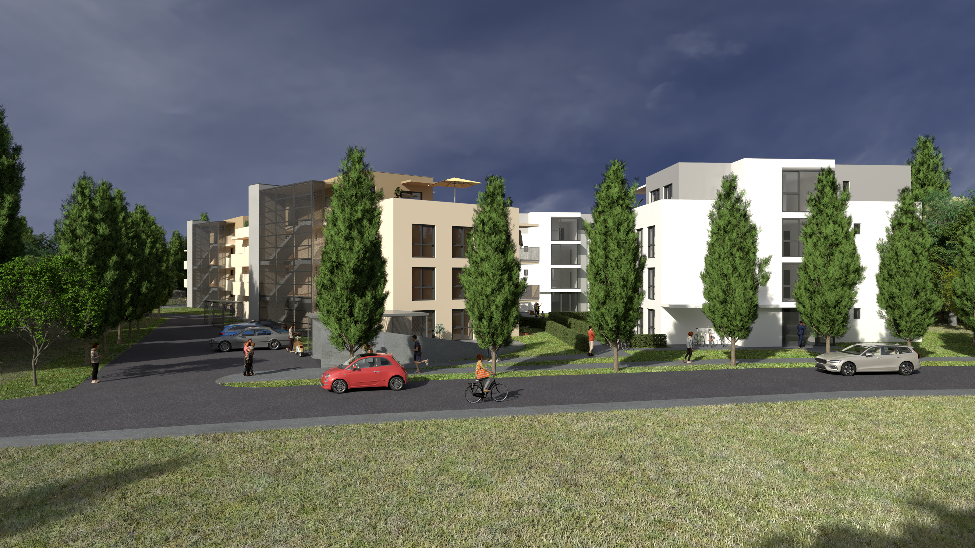 Aufgrund der bestehenden Nutzungen und Ausweisungen im Flächenwidmungsplan wird städtebaulich auf die Umgebung reagiert. Das Projekt umfasst eine Wohnbebauung mit insgesamt 58 Wohneinheiten in fünf Baukörpern (Erdgeschoss, zwei Obergeschosse und eine Penthouse-Etage) mit Wohnungsgrößen zw. 39-81m² mit Balkonen und teilweise Gärten. Eine Tiefgarage mit insgesamt 62 Stellplätzen ermöglicht, dass die Erdgeschosszone weitgehend autofrei bleibt. Außerdem verbindet die Tiefgarage vier der fünf Baukörper unterirdisch und barrierefrei miteinander.