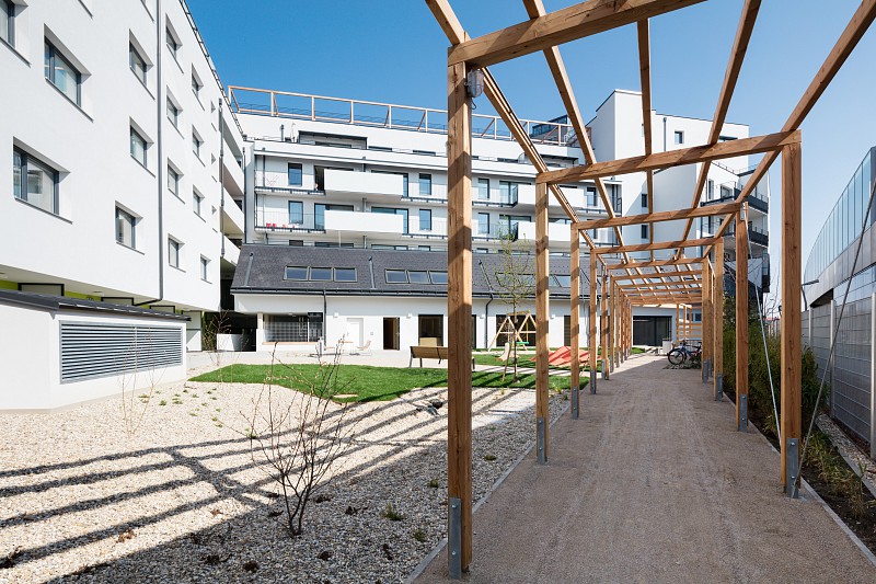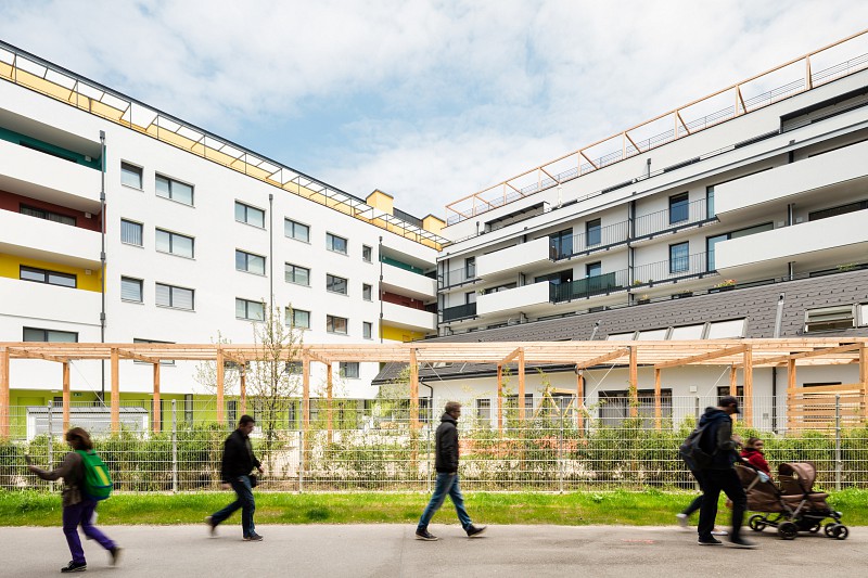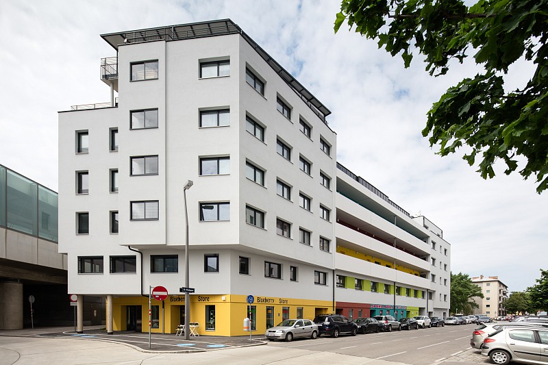 Die Familienwohnbau hat in 1220 Wien, Schickgasse 32 eine Wohnhausanlage mit Büros/Geschäftsflächen/Kindertagesheim in Passivhausbauweise errichtet. Die Beheizung erfolgt mittels einer Wasser/Wasser Wärmepumpe als Niedertemperatursystem für die Fußbodenheizung. Die Warmwasserbereitung erfolgt mittels Solaranlage unterstützt durch Gas. Es wurde eine kontrollierte Wohnraumlüftung mit Wärmerückgewinnung eingebaut.