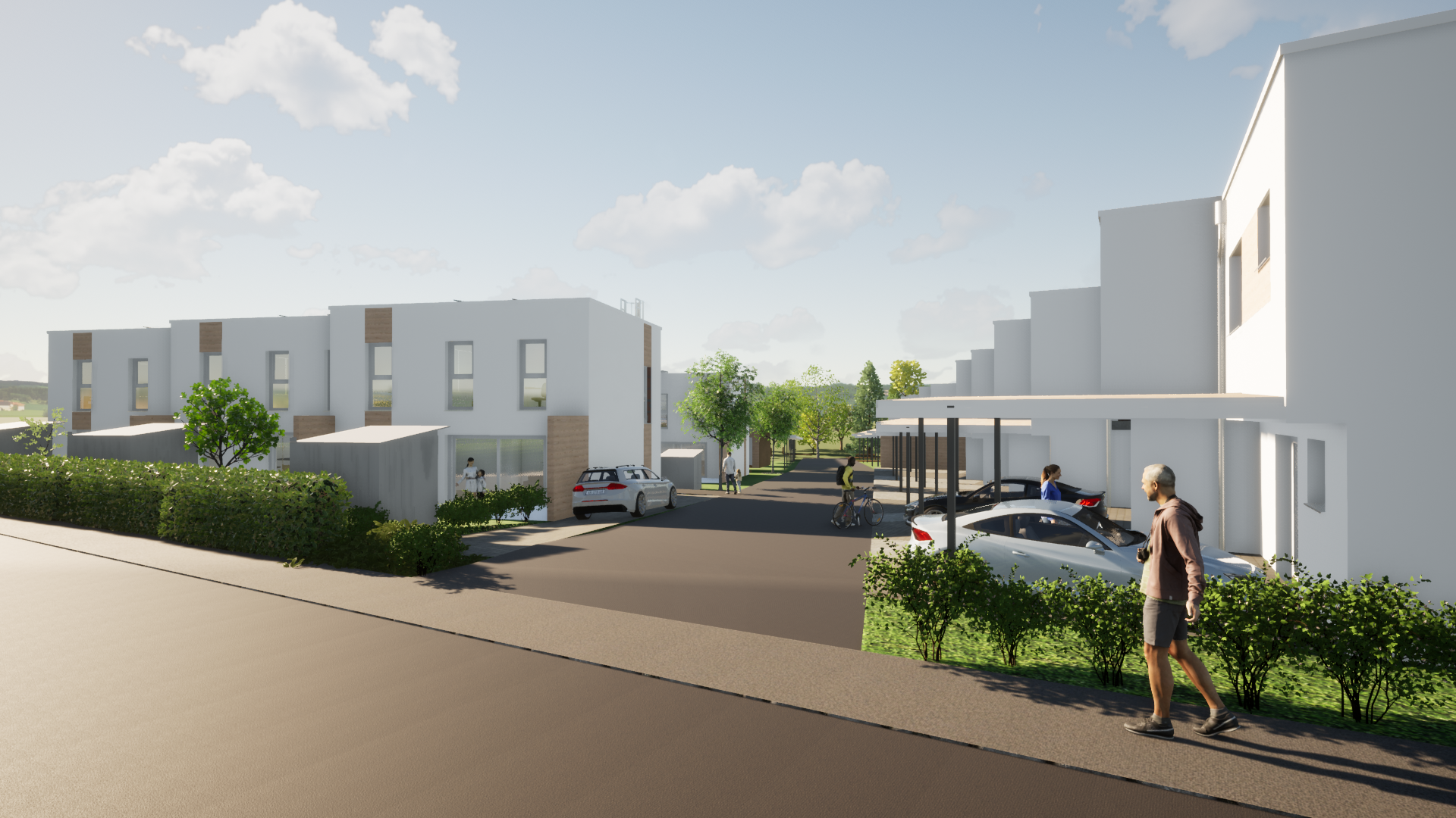 Wohnhausanlage bestehend aus 5 Reihenhausblöcken mit insgesamt 23 Wohneinheiten, Carports, Gartengerätehütten, Müllraum und Hausbetreuerraum.