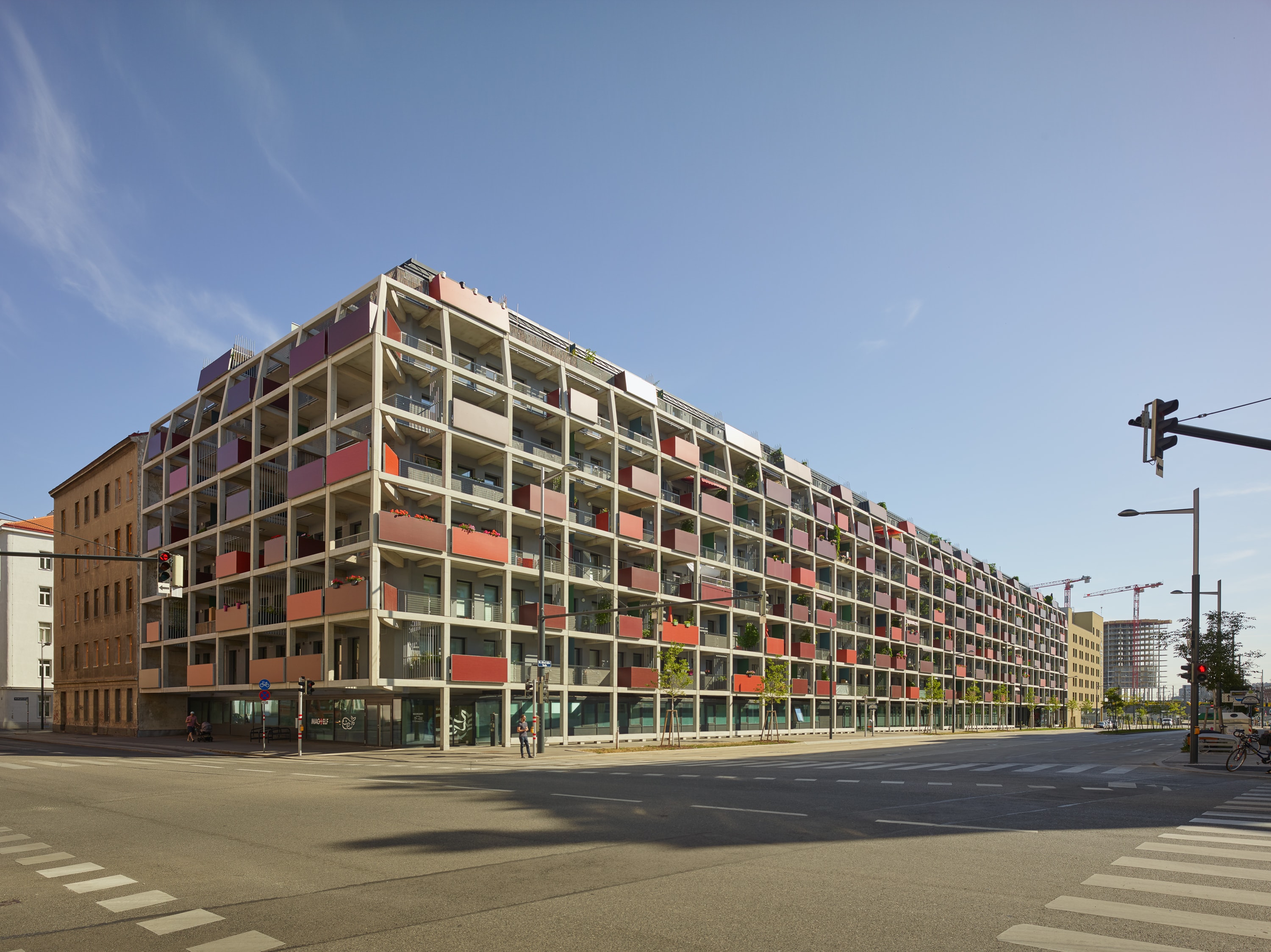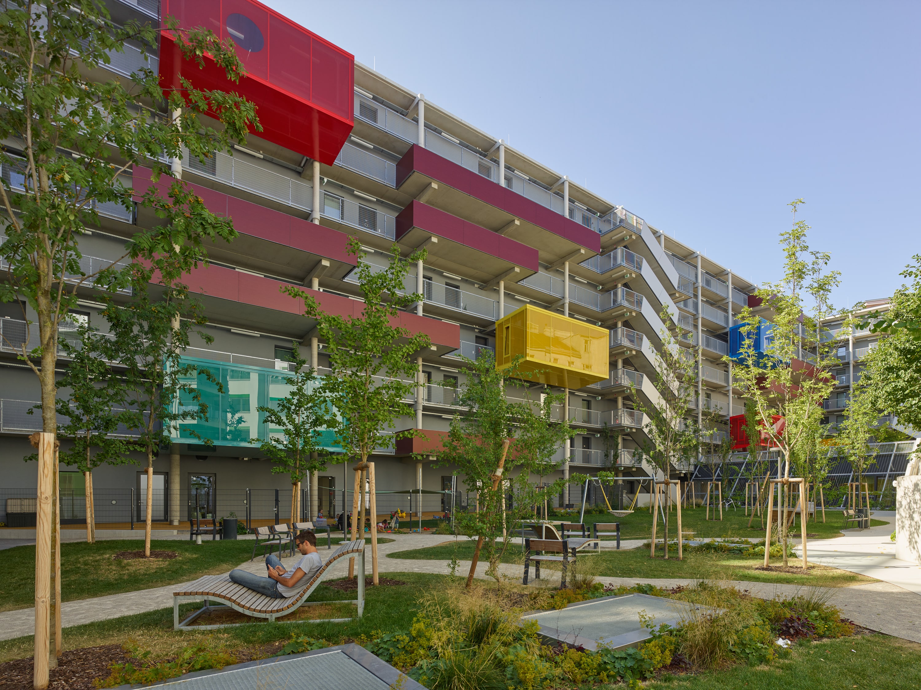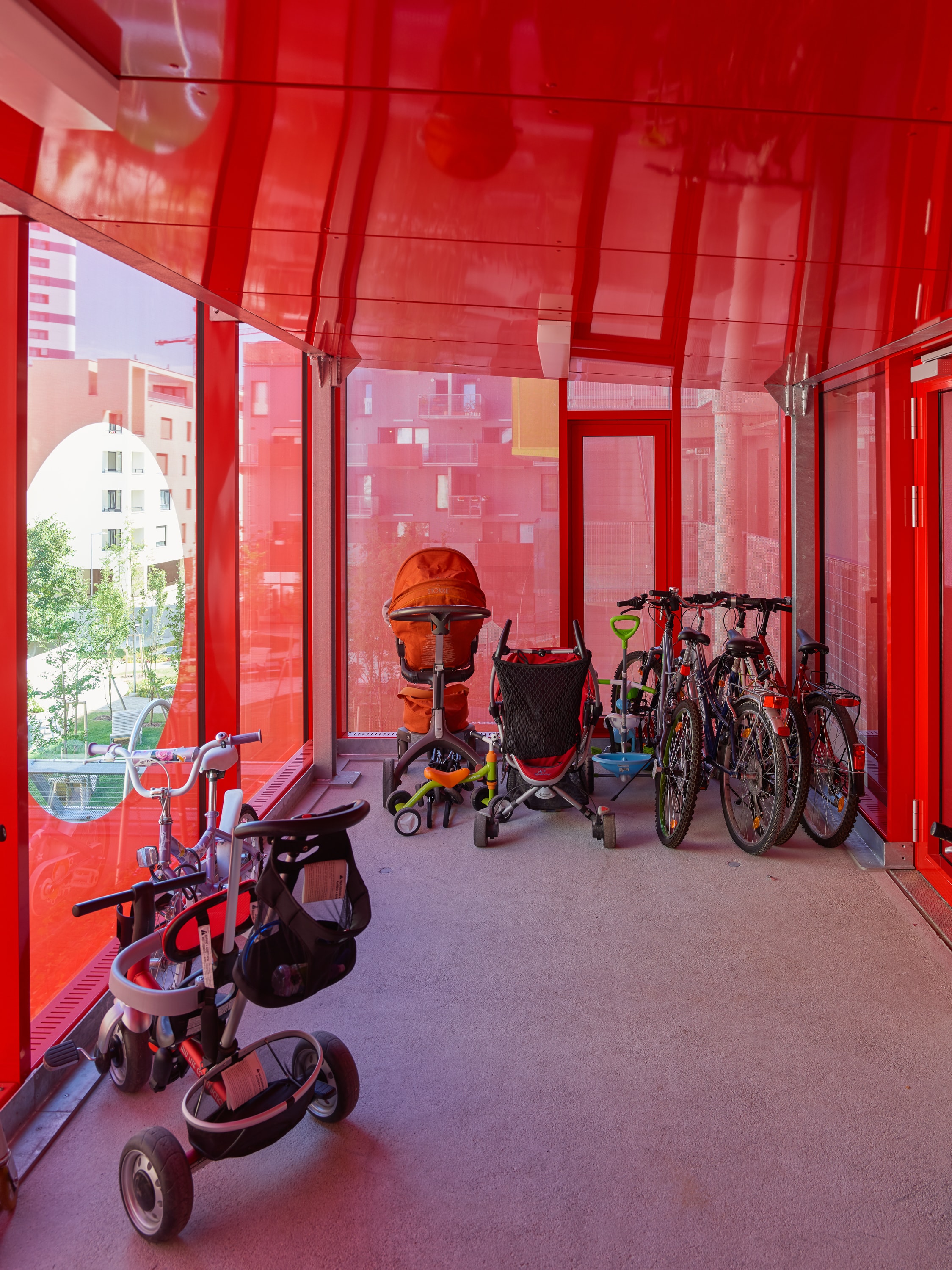 Vom privaten Innenhof, der Spiel- und Grünflächen bietet, erschließen offene Laubengänge die Wohnungen und erweitern sich immer wieder zu informellen Begegnungszonen. Sechs bunte aufgesetzte Boxen beinhalten gemeinschaftliche Abstellplätze, Waschräume und Spielflächen.